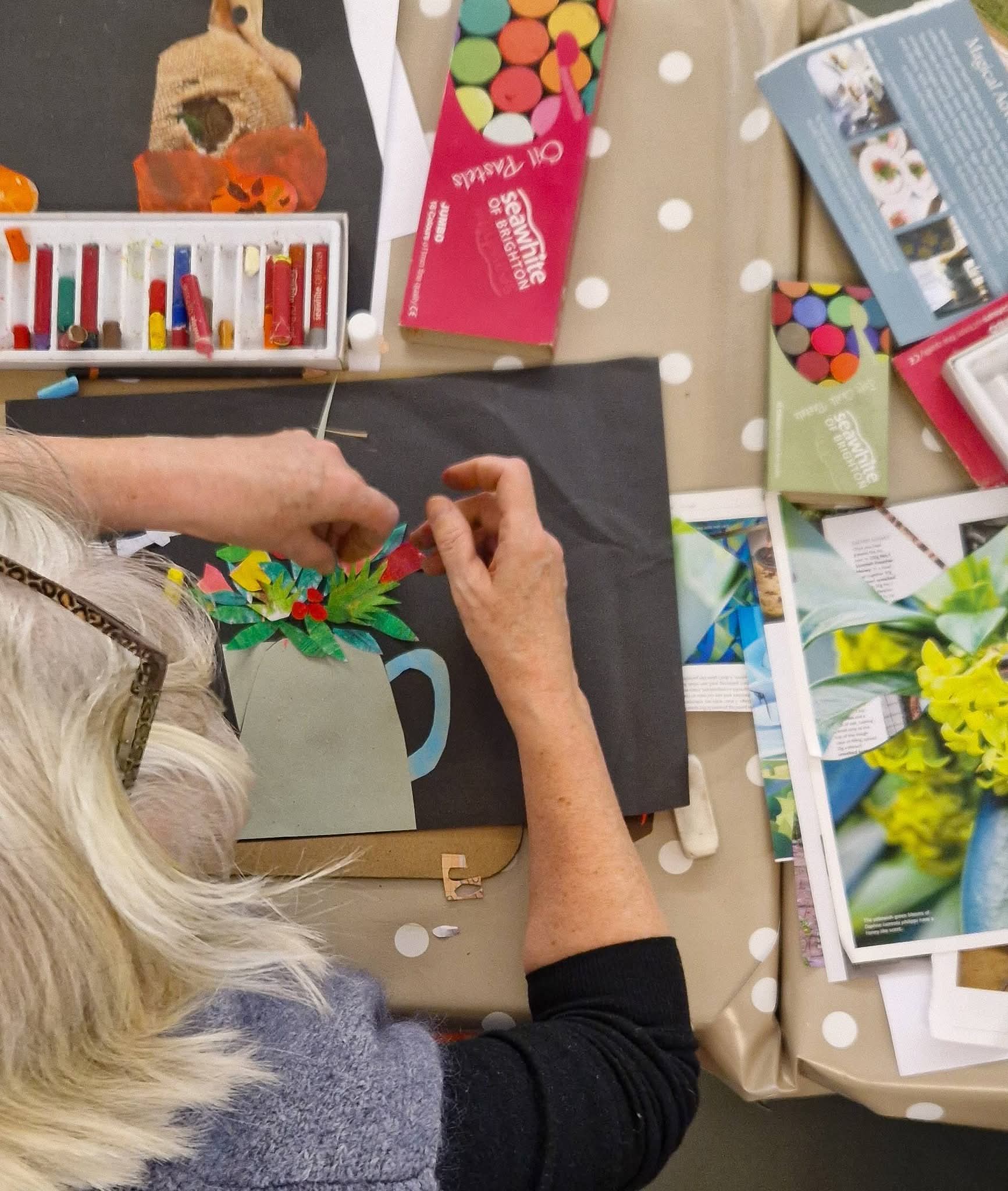 Still life drawing and collage. This month's sessions feature an optional collage twist, inviting you to slow down, play with paper, and draw on a surface you create. Experiment with layering different-coloured and textured papers, magazine and newspaper cuttings, cut and stick shapes to create an interesting surface to draw on top of.