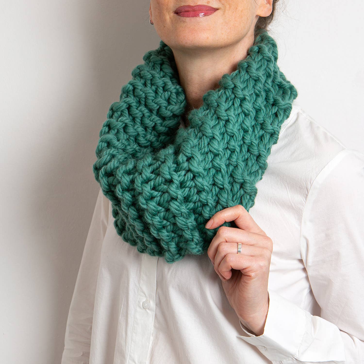 Absolute Beginners Cowl Knitting Kit. Keep cosy this season with our garter stitch chunky cowl, perfect to drape around your neck on those chilly days. It is ideal for dressing up or down. We love this absolute 'beginners' pattern which includes a 'How To Knit Manual' to guide you through your first knitting project.